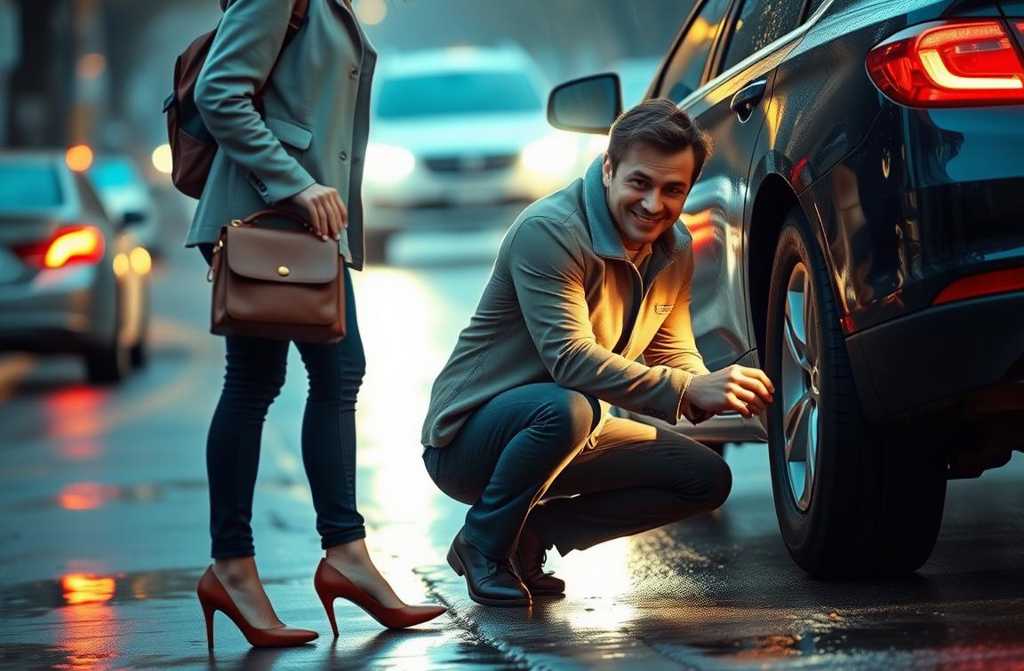 Elle contemplait le coffre ouvert, se demandant si elle devait appeler une dépanneuse, quand un 4×4 sarrêta à côté. Un homme en descendit.