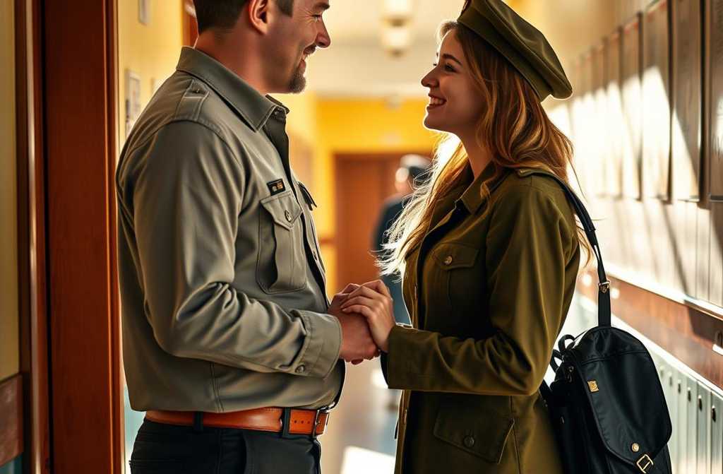 En sortant, elle aperçut au bout du couloir un homme en uniforme militaire, dos tourné, regardant par la fenêtre. Quand il se retourna avec un sourire, elle nota :