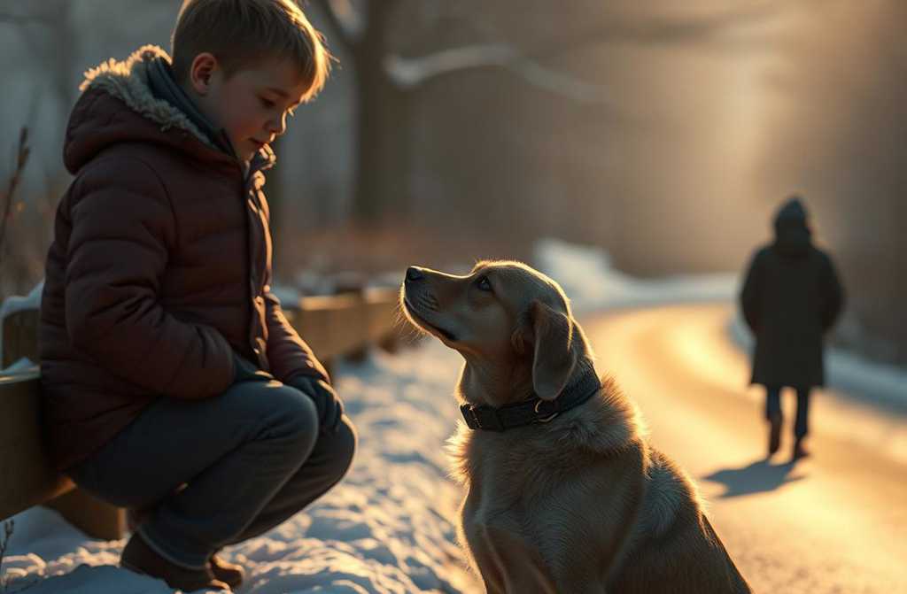 La tête penchée, le pauvre chien lécoutait avec méfiance, refusant tout contact. Mais peu à peu, une amitié naquit, et bientôt, ils sassirent ensemble au bord de la route, observant les voitures filer.