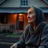 Une vieille dame assise sur un banc devant la maison qui n’est plus la sienne.
