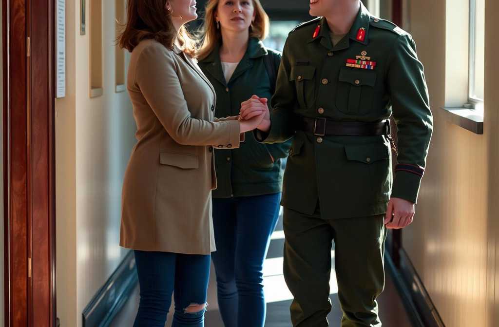 Dans le couloir, elle aperçut un homme en uniforme militaire, tourné vers la fenêtre. Quand il se retourna, elle nota :
