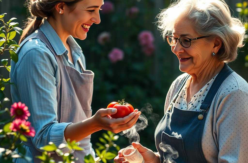 «Je pensais que, comme votre dos vous empêche de vous pencher, je pourrais venir vous aider à arroser et désherber. Vous pourriez me montrer comment prendre soin des tomates correctement.»