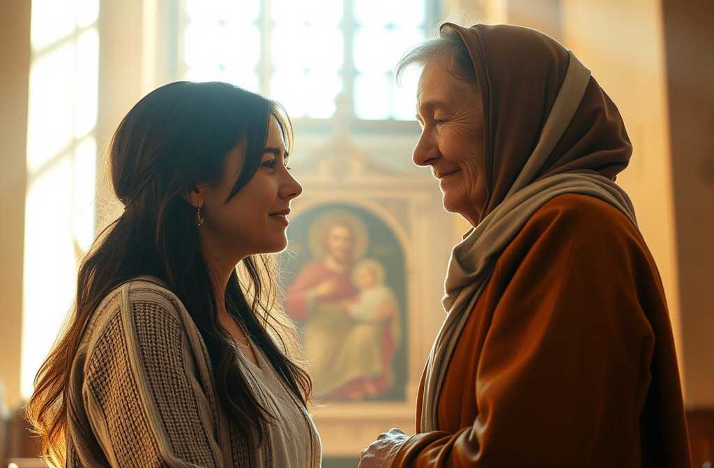 Une messe était en cours, il ny avait pas beaucoup de monde. Élodie avança et regarda autour delle, cétait sa première fois dans une église. Son regard se posa sur une grande icône : une jeune femme tenant tendrement un bébé dans ses bras. Élodie resta hypnotisée par cette image. Au bout dun moment, une voix douce lui chuchota à loreille :