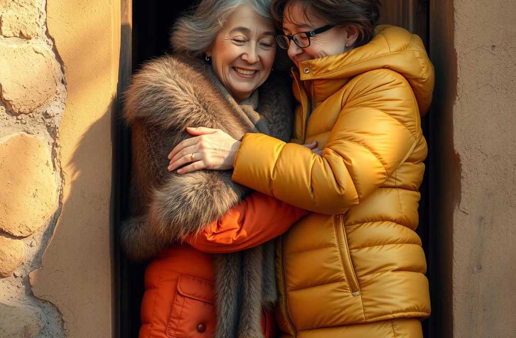 Le lendemain, Valérie accompagna Gisèle à larrêt de bus, lui offrant un morceau de magret de canard, du bon saucisson aux noisettes et un pot de confiture de framboises maison. Dehors, le froid accentuait le contraste entre la tenue citadine de Gisèle un doudou moderne, un béret en fourrure, des talons modestes, les lèvres teintées de rouge à lèvres et la tenue rustique de Valérie, long manteau dépassé, des sabots et un grand châle en laine.