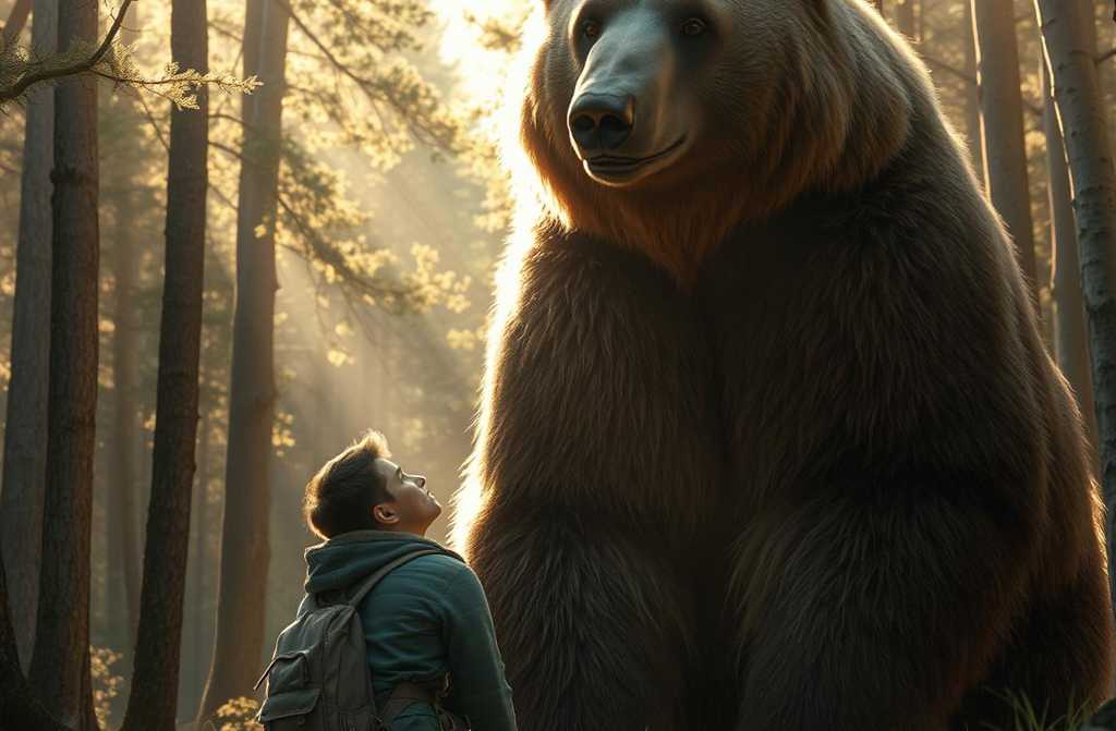 Les loups se figèrent, leurs oreilles se dressèrent, leurs corps se raidirent. Quelques instants plus tard, une silhouette massive émergea de lombre des arbres. Un ours brun savance lentement sur la clairière, chaque pas résonnant comme un tonnerre dans la poitrine dHenri.