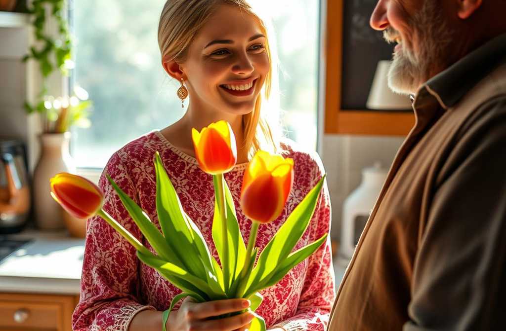 Je lai invité à entrer, lui proposant du thé. Il a sorti un petit bouquet de tulipes du sac, les a tendues. Mes yeux se sont remplis de lumière. Nous avons parlé du temps, des prix du marché, et, après le thé, il sest levé pour partir. Enfilez son manteau, il sest arrêté à la porte, sest retourné et a dit :