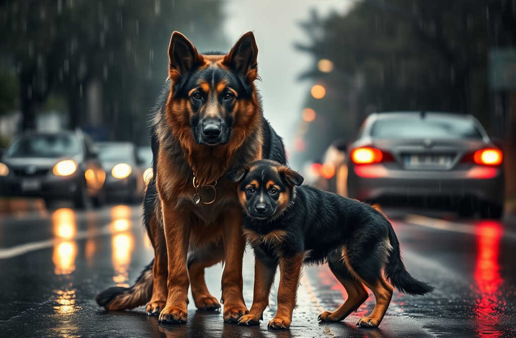 Le chiot sappuya sur ma jambe, frissonnant mais avec une lueur de confiance dans le regard. La mère sassit un peu plus loin, la queue effleurant la route mouillée, comme pour dire: «Tu nous as aidés, maintenant aidele encore.»