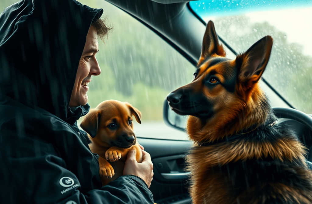 Le chiot sappuya sur ma jambe, frissonnant, mais ses yeux brillaient dune confiance lumineuse. La mère sassit un peu plus loin, la queue caressant le bitume mouillé. Cétait comme si elle murmurait :