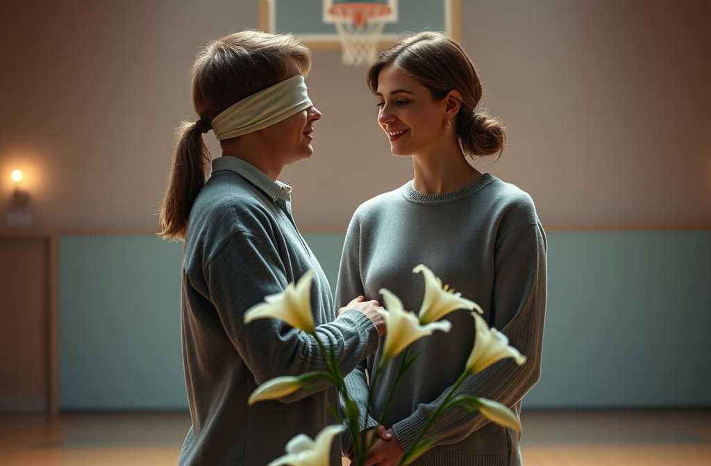 Кирилл снимает повязку. Тусклый свет освещает старый школьный спортзал, где когдато началась их история.