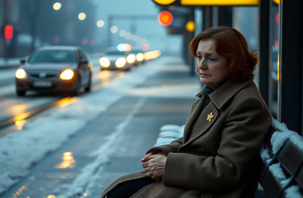 Assise sur un banc au fond du hall, recroquevillée sous un vieux manteau, le regard baissé. Ses mains tremblaient, et à ses pieds gisait le même sac en toile avec des bouteilles. Son visage était pâle, les yeux voilés.
