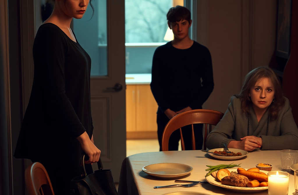 Véronique tourne le regard vers sa fille. Océane reste figée à la table où toute la famille vient de dîner. Ses lèvres se pincent en une ligne fine, sa peau pâlit, presque translucide. Ses mains reposent, immobiles, sur ses genoux. Véronique voit sa fille essayer de garder son calme, mais la tension dans les épaules lui montre que chaque parole dAndré la frappe en plein cœur.