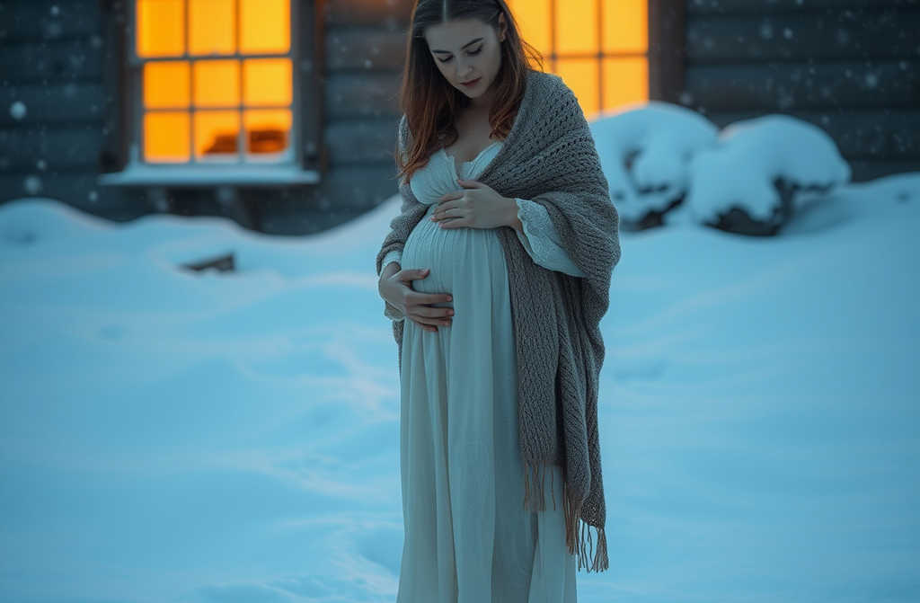 Сквозь сугробы она, едва пробираясь к входной двери, открыл её и замерла, не веря своим глазам. На ледяном пороге, держась за ограду, стояла молодая девушка в ночной сорочке, босиком, с вязаной шалью на плечах. Её живот был уже заметно округлым она была беременна.