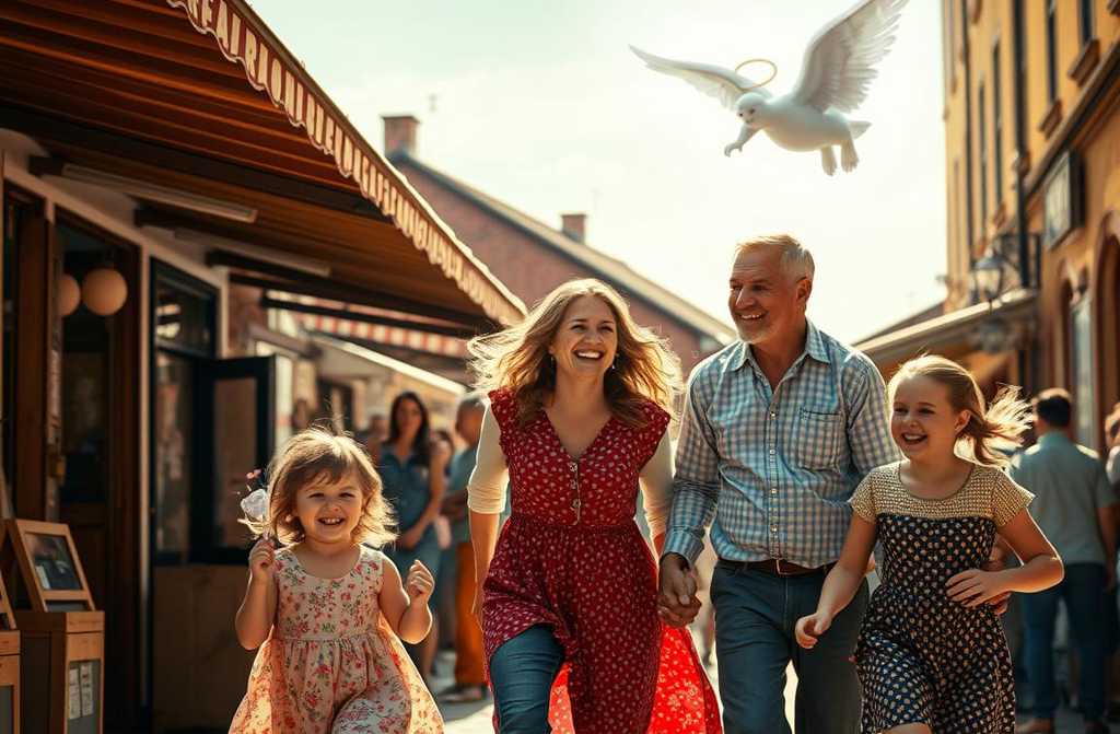 Ils partirent. Elle le prit par le bras comme si elle guidait leur vie de main ferme. Il marchait à ses côtés, le cœur réchauffé par une tendre, solide affection. Devant eux, leurs enfants deux petites tornades de bruit, de désordre et de joie infinie couraient, riant et se poussant. Et derrière ce petit carrosse de bonheur, un ange gardien invisible battait des ailes, éloignant les malheurs dune caresse.