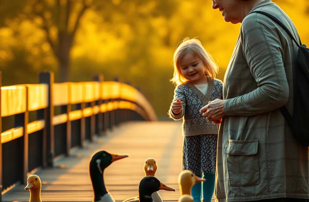 Grandmaman, les canards préfèrent de plus gros morceaux! Clémence me glisse un reste de baguette. Toi aussi, lance.