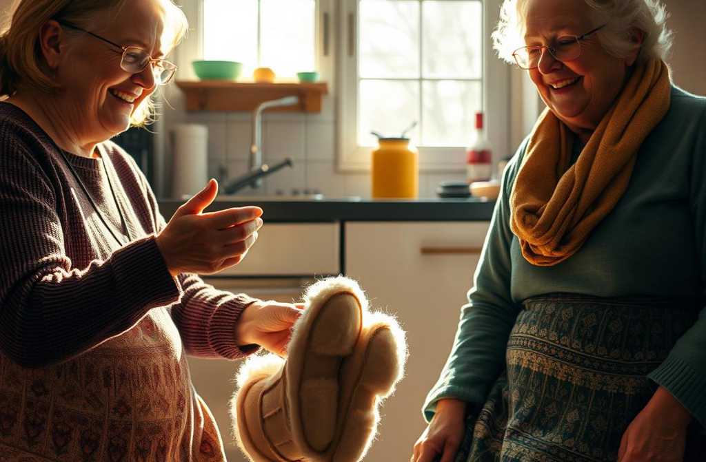 «Des pantoufles? demanda Sonja, haussant les sourcils. Des pantoufles en feutre de brebis? Elles gardent les pieds au chaud, même si les chaussettes en laine sont déjà offertes par nos sponsors».