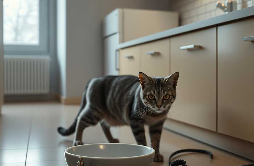 Un matin, Élodie se réveille et découvre son bol vide. La chatte regarde, attend un instant, puis se fâche mais cela ne fait quaugmenter son besoin de manger. Le téléphone de la propriétaire sonne dans la pièce, une fois, puis une seconde fois.