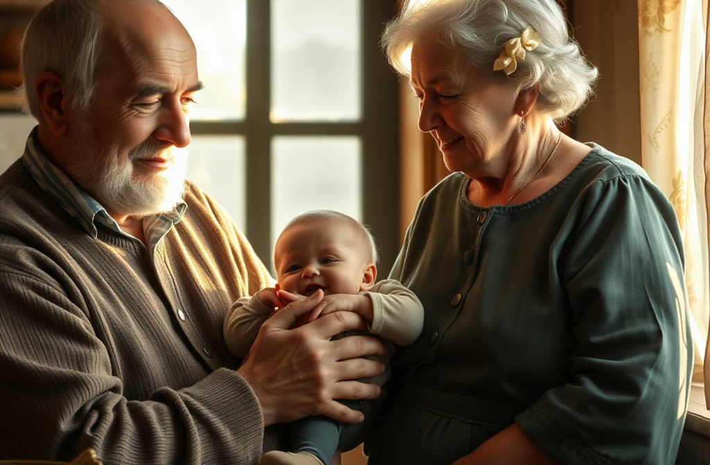 Николай, поглаживая небольшую бороду, разглядывает внука. Жена, мать Алёны, тянется к ребёнку.