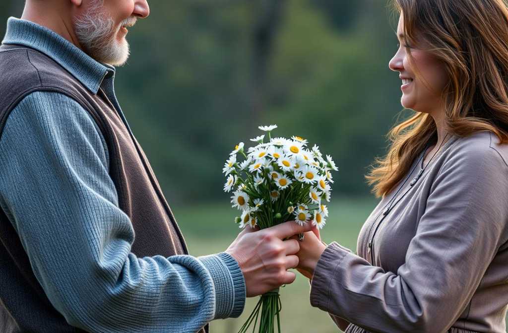 Ils vivaient dans un petit hameau près de la forêt de Fontainebleau. Pas de restaurants chics, pas de boutiques de fleurs luxueuses. Alors Henri offrait à Claire ce qui poussait autour deux : des jonquilles, des coquelicots, des marguerites, des bleuets. Il se rendait sur le pré après le travail, même fatigué, et revenait avec un bouquet à la main. Il le faisait chaque année, tant quil pouvait marcher. Et quand la maladie la cloué au lit, cest ma mère qui sortait dans le jardin et cueillait les fleurs pour les poser près de lui.