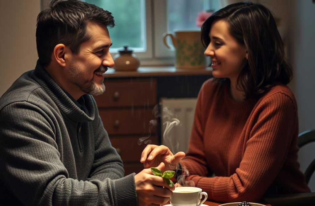 Алина ставит перед ним чашку с мятным чаем и садится рядом: