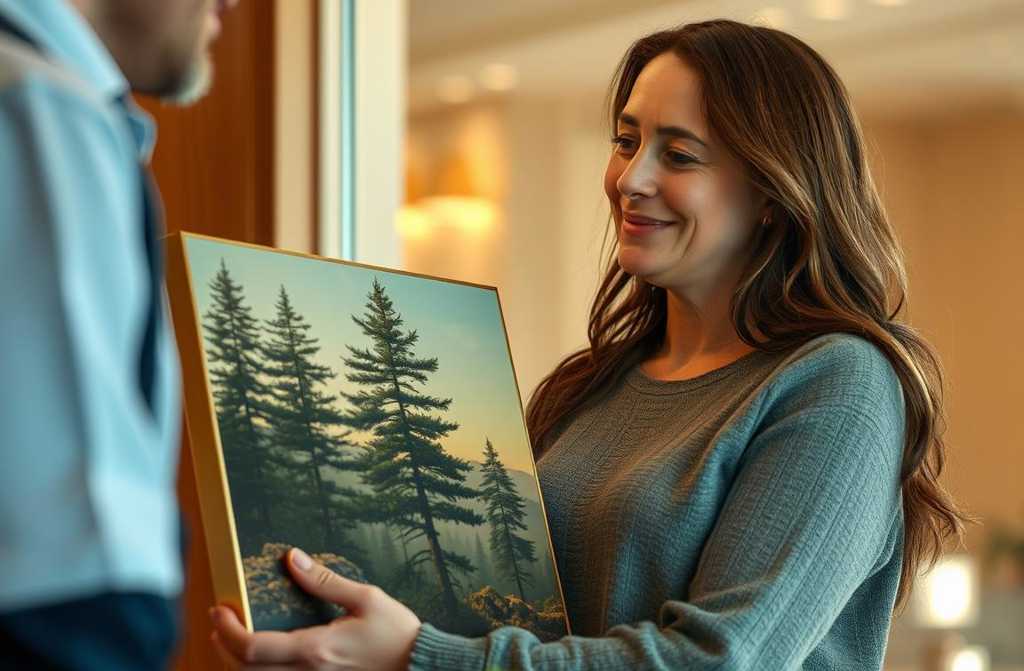 Наутро Сергей проверил номер, увидел картину и замер. На полотне молодая пара, идущая по сосновому бору. Он узнал её: это был момент из его самого счастливого детства, когда с мамой они гуляли в лесу. Сердце сжалось.