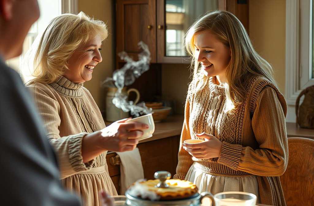 Воскресное утро. К двенадцати на кухне уже стоял идеальный яблочный пирог румяная корочка, аромат корицы, аккуратные дольки яблок, выстроенные рядами. Татьяна Ивановна в накрахмаленном фартуке и с безупречной причёской накрывала стол.