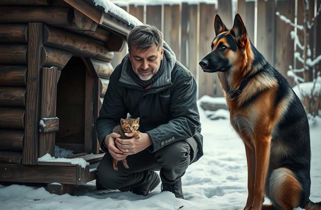 Внутри, свернутый в одеяло, лежал крошечный котёнок грязный, замёрзший и едва дышащий. Глаза открывались с трудом, тело дрожало от холода. Барс нашёл его гдето и, вместо того чтобы прогнать или оставить, укрыл. Он спал снаружи, чтобы не напугать, и охранял вход, будто в будке хранилась драгоценная сокровищница.