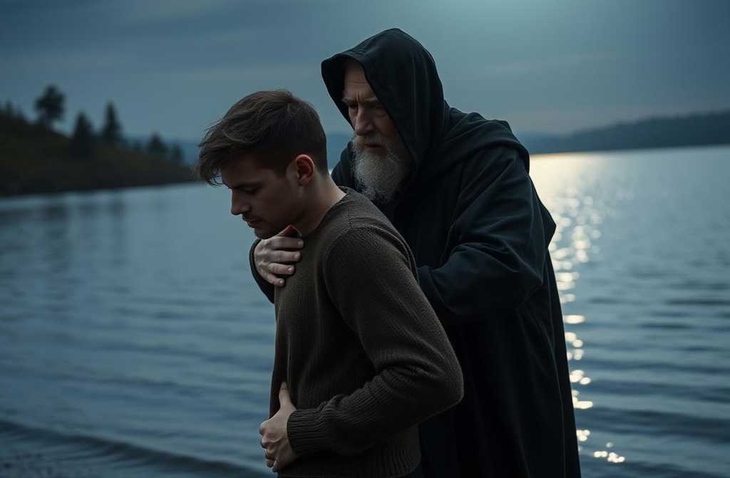Он бросился в воду, но ктото схватил его за рубашку и вырвал на берег. Оглядевшись, он увидел старика в чёрном плаще, на шее у него висел крест, привязанный к верёвке.