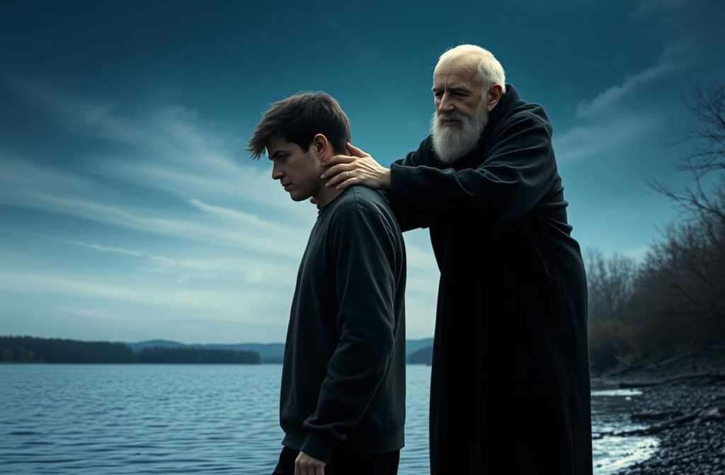 Sans réfléchir, il sélança dans leau. Un vieil homme en habit noir, une croix pendue à une corde autour du cou, le saisit par la chemise et le jeta sur le rivage.