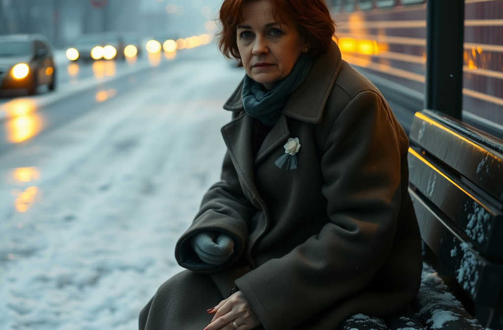 Assise sur un banc au bout du hall, recroquevillée sous un vieux manteau, le regard perdu. Ses mains tremblaient, et à ses pieds reposait le même sac en toile avec des bouteilles. Son visage était pâle, ses yeux feints.