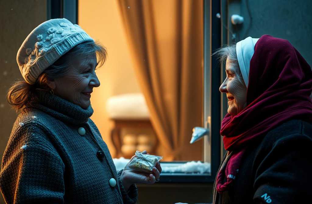 En soirée, bien emmitouflée, jen prends trois dun côté, trois de lautre, le reste viendra plus tard. Je commence par les voisins du bâtiment : lhomme au rez-de-chaussée et la voisine du dessus.