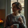 Une jeune femme aux cheveux remontés, un pull, tenait une tasse à la main.